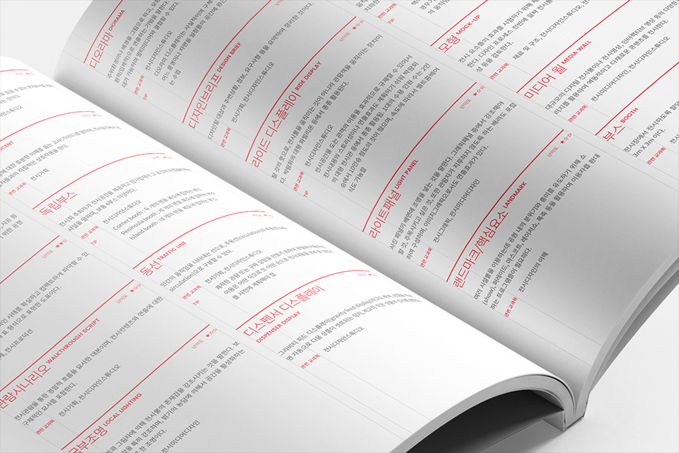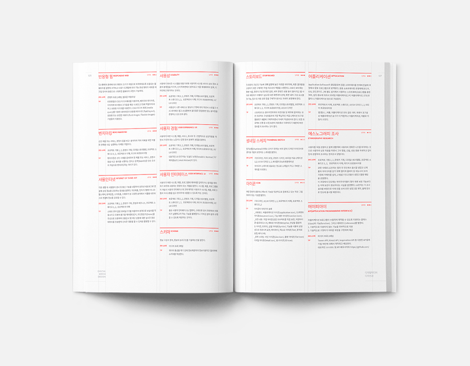 계원예술대학교스러운 아이덴터티를 유지시키는 방안 뿐만아니라, 디자인 관련 대학교 답게 시각적으로 크리에이티브한 용어집이 될 수 있도록 디자인하였습니다.