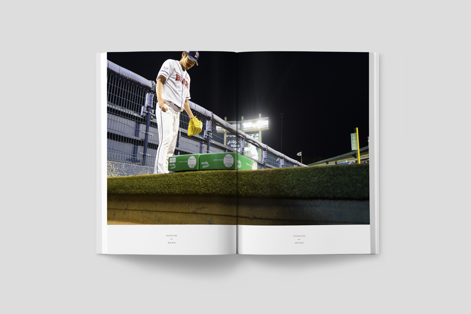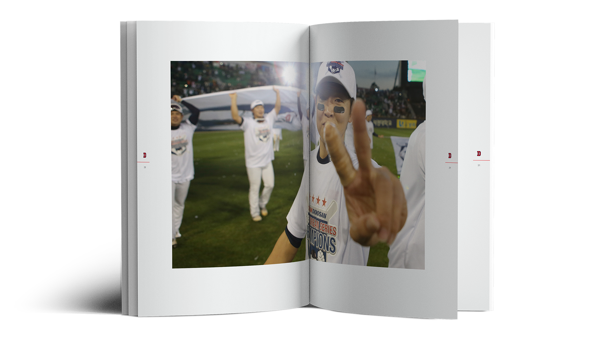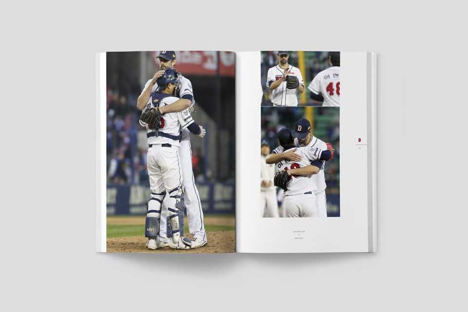 책의 전체적인 톤 앤 매너는 두산베어스의 정체성을 유지하되, ‘챔피언’이라는 위상에 걸맞은 프리미엄 무드를 지향했습니다. 엠블럼과 주요 타이포그래피에 적용된 골드 컬러는 승리의 찬란함을 상징하며, 정제된 블랙과 화이트의 대비는 사진이 가진 본연의 힘을 극대화합니다. 이는 팬들에게 단순한 기념품이 아닌, 소장 가치를 지닌 하나의 아트북으로 인식되게 합니다.