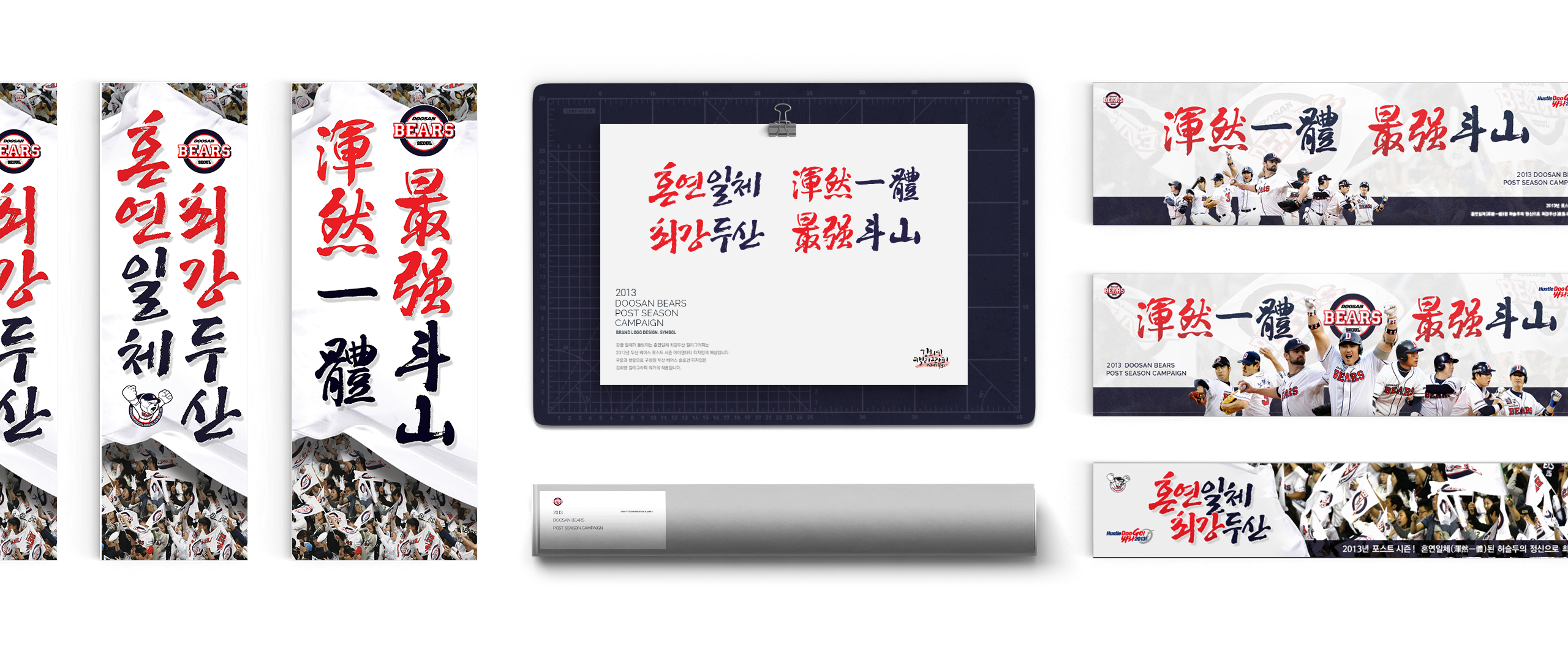 캘리그래퍼 김희영 작가와의 협업을 통해 탄생한 타이포그래피는 두산베어스 특유의 ‘허슬 두(Hustle Doo)’ 정신을 거친 획과 역동적인 리듬감으로 표현했습니다. 잉크의 번짐과 강한 필압은 마운드 위 선수들의 땀방울과 관중석의 함성을 시각적 매개체로 연결합니다.